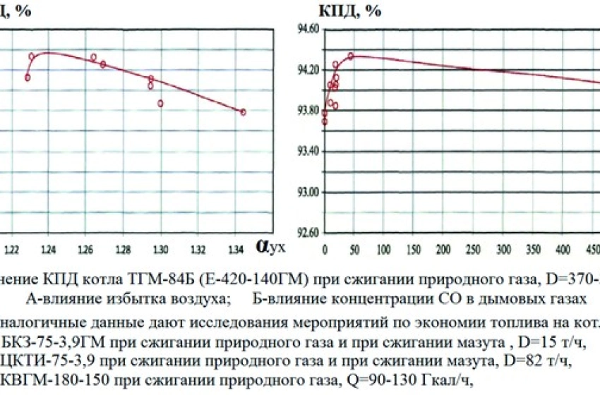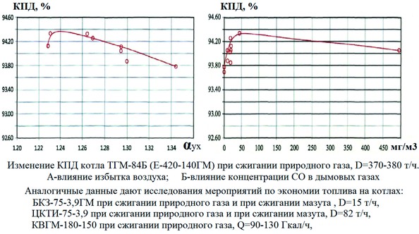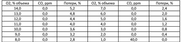 По результатам исследований МЭИ [3], [4], сжигание именно в условиях умеренной химической неполноты сгора-ния в разрешенных [9] [10][11] пределах 20-100 ppm моно оксида углерода, является эффективным режимом с экономией топлива, максимально возможным КПД котла и понижением образования NOX на 30-40%. Теоретические выкладки полностью подтверждены результатами замеров при сжигании газа и мазута в энергетических установках различной мощности (без учета дополнительного снижения затрат на дутьё ДВ и тягу ДС).