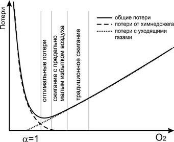 По исследованиям [8], минимум суммарных тепловых потерь энергетической установки с уходящими газами и от химической неполноты сгорания лежит в области сжигания топлива с умеренным химическим недожогом.